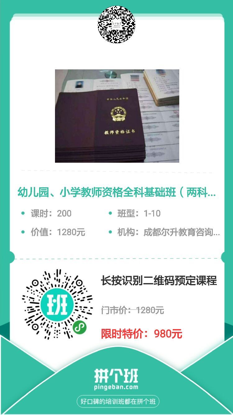 微信長(cháng)按識别上圖二維碼,即可發(fā)起(qǐ)拼單!報名後(hòu)轉發(fā)鏈接至下一個報名夥伴,以此類推,五人成(chéng)團,即可享受拼單價格!980元,不僅包含全科課程,還(hái)免費贈送教輔資料哦!拼班爲期一個月。距離教師資格考試還(hái)有五個月,趕緊拼班備考吧!!!